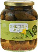 Gurken**, Wasser, Branntweinessig*, Agavendicksaft*, SENFsaat**, Meersalz, Dill**, Zwiebeln**, Paprika*| Energie | Fett | gesättigte Fettsäuren | Kohlenhydrate | Zucker | Ballaststoffe | Eiweiss | Salz |