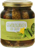 Gurken**, Branntweinessig*, Wasser, Agavendicksaft*, Meersalz, SENFsaat**, Dill**, Zwiebeln**, Paprika*.| Energie | Fett | gesättigte Fettsäuren | Kohlenhydrate | Zucker | Ballaststoffe | Eiweiss | Salz |