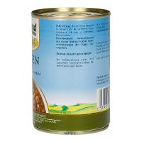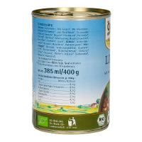 Trinkwasser, 19% Linsen*, Fleisch (Schwein*, Rind*), Karotten*, Kartoffeln*, Zwiebeln*, Lauch*, SELLERIE*, Sonnenblumenöl*, Steinsalz, Maisstärke*, Rohrohrzucker*, WEIZENMEHL*, Meersalz, Verdickungsmittel: Guarkernmehl*; Tomatenmark*, Branntweinessig*, Gewürze* (Macis*, Curcuma*, Pfeffer*, Ingwer*, Knoblauch*, Koriander*, Kümmel*), Kräuter*(Liebstöckel*, Petersilie*, Rosmarin*), Dextrose*, Schafsaitling, Rauch.| Energie | Fett | gesättigte Fettsäuren | Kohlenhydrate | Zucker | Ballaststoffe | Eiweiss | Salz |