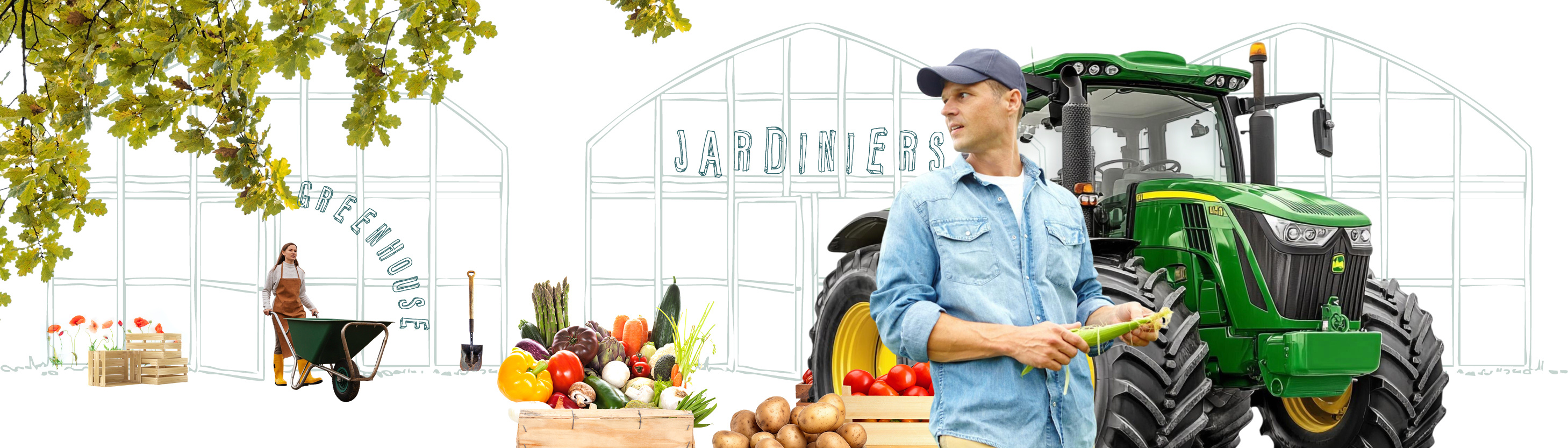 KI generiert: Ein Mann steht vor einem Traktor und Gemüse; im Hintergrund Gewächshaus. Text: "GREENHOUSE", "JARDINERS".