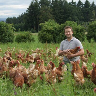 Weil unsere Eier ein besonders gelbes, sahniges Dotter haben, sind sie in der ganzen Region gefragt. Sie schmecken so gut, weil unsere 2.400 Hühner ein gesund-vergnügtes Leben führen. In der Vegetationsperiode sind sie in unseren Hühnermobilen in der freien Natur unterwegs und picken neben Getreide viel frisches Gras. Aus ethischen Gründen haben wir uns zudem der Brudertierinitiative Deutschland (BID, ehemals Bruderhahninitiative Deutschland) angeschlossen. Die Brüder unserer Legehennen werden nicht getötet – weder nach dem Schlüpfen, noch davor (In-Ovo-Selektion). In Kooperation mit unserem Junghennenaufzüchter werden sie gemästet und zu leckeren Bruderhahnprodukten wie Frikassee und Suppe verarbeitet.