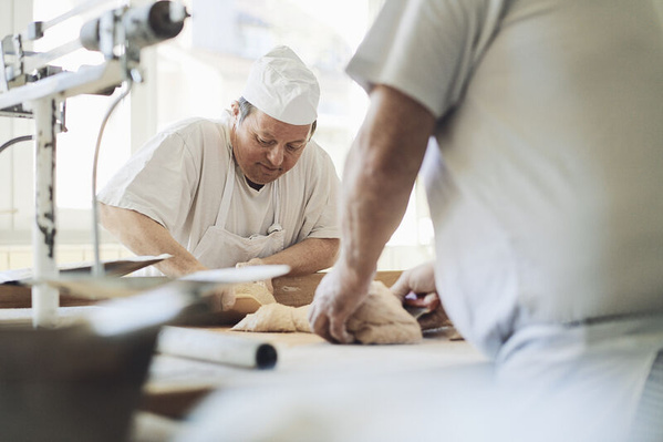 Neun Menschen mit besonderen Bedürfnissen helfen den Bäckermeistern und –gesellen, Brotteig abzuwiegen, zu formen, in den Ofen zu schieben und herauszuholen sowie die fertigen Brote zu lagern. Da die Kunden pünktlich beliefert werden müssen, muss ebenso zügig wie sorgfältig gearbeitet werden. Später müssen die verwendeten Behälter und Schüsseln sowie die ganze Backstube gründlich gereinigt werden. Unsere Bäcker sind sehr stolz auf ihre Arbeit.